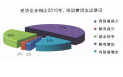 52%的企業(yè)對培訓(xùn)費(fèi)用的支出都略有增加,有明顯增加的占18%,基本持平的占26%,企業(yè)對培訓(xùn)費(fèi)用的支出穩(wěn)中有升。