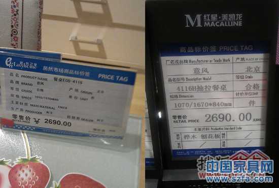 同品牌同款產(chǎn)品在居然之家、紅星美凱龍的價(jià)簽
