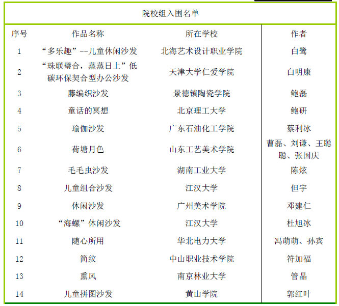 以下是本屆設(shè)計大賽院校組和專業(yè)組的入圍名單(按照參賽作者拼音字母排序):