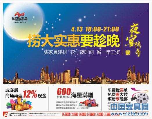 買(mǎi)家具建材,撈大實(shí)惠要趁晚!歐亞達(dá)家居夜宴通過(guò)兩周的醞釀終于揭開(kāi)了神秘面紗。泉城的消費(fèi)者終于找到“提前購(gòu)買(mǎi)家具建材,五一放心旅游”的機(jī)會(huì)。本次活動(dòng)歐亞達(dá)家居還推出了“花一夜時(shí)間,省一年工資”的口號(hào),這句話(huà)放在裝修房子買(mǎi)家具這件事情上,意思是說(shuō)通過(guò)歐亞達(dá)家居413夜宴帶來(lái)的極限優(yōu)惠可以省掉您一年的工資。如此誘人的活動(dòng)趕快來(lái)參加吧!