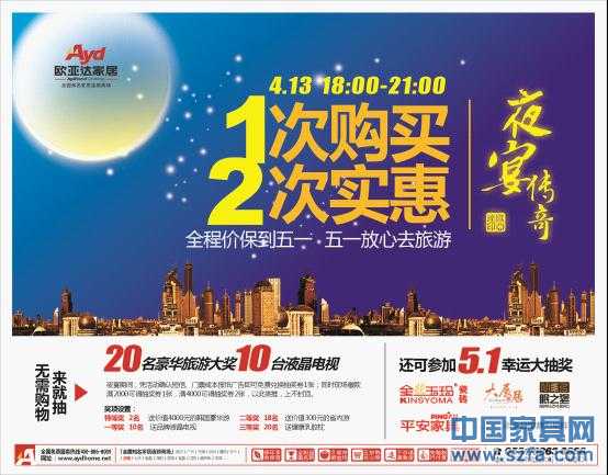 當(dāng)您在報(bào)紙上、網(wǎng)站上看到又或者是在電臺(tái)廣播中聽(tīng)到歐亞達(dá)家居夜宴的活動(dòng)內(nèi)容時(shí),可能都會(huì)被這次的活動(dòng)力度、超值大獎(jiǎng)所吸引,甚至要為之一動(dòng)!但是仔細(xì)想來(lái)又怕馬上到來(lái)的五一活動(dòng)會(huì)更加優(yōu)惠,相信很多消費(fèi)者都有這樣的疑慮。當(dāng)筆者也帶著同樣的疑問(wèn)詢(xún)問(wèn)到這次活動(dòng)的策劃人員,“為讓有需要的顧客打消這種疑慮放心參加這次活動(dòng),為讓消費(fèi)者切切實(shí)實(shí)享受到這次活動(dòng)的優(yōu)惠,歐亞達(dá)家居鄭重承諾:價(jià)保到五一,差價(jià)3倍返還。”