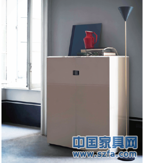 Flexform旗下的mood品牌推出的RAFEL系列柜體,均將頂部面板材料換成大理石,雖然這個床頭柜整體呈卡其色和白色的調和色,但頂部大理石面板的斜角處理使得頂板顯得更加出挑,整個柜體也顯得不再封閉。大理石的冰冷感和柜體亮光的冰冷感相一致,而賦予卡其色后又拉近了產品與人的距離。
