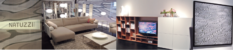 NATUZZI今年聘用專業(yè)的水體攝影師Gianni Basso,讓其用攝影加抽象的手法,表達(dá)水的多姿和靈動。整個展廳的墻面裝飾通體為變形的水波紋,其曲柔的形態(tài)沖淡家具形體的生硬,貌似流淌的靈動感賦予家具無限的生命力。