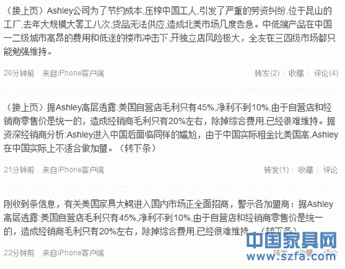 剛收到信息,有關(guān)美國家具大鱷進入國內(nèi)市場正全面招商,警示各加盟商:據(jù)Ashley高層透露:美國自營店毛利只有45%,凈利不到10%,由于自營店和經(jīng)銷商零售價是統(tǒng)一的,造成經(jīng)銷商毛利只有20%左右,除掉綜合費用,已經(jīng)很難維持。