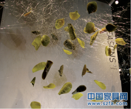 季節(jié)給人們的感官是豐富的,是用過景象、氣味、聲音等多維度來感知的,因此我們對(duì)季節(jié)的表達(dá)也往往會(huì)借助多重媒體。但這個(gè)創(chuàng)意,僅通過編織一種手法,用透明的絲線將葉子串起,便 將落葉飄零的秋景栩栩如生、淋漓盡致的表現(xiàn)到位了。