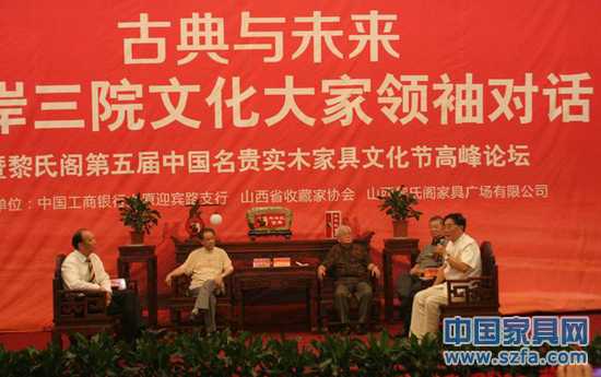 當(dāng)天下午 “古典與未來——兩岸三館文化大家領(lǐng)袖對話暨名貴實木家具文化節(jié)高峰論壇”在焦煤大廈隆重舉行,南京博物院原院長徐湖平;臺北故宮博物院原文獻處處長吳哲夫;臺灣文物學(xué)會理事,收藏家徐振夫;《收藏》雜志創(chuàng)始人楊才玉在現(xiàn)場圍繞文化與收藏的話題與現(xiàn)場觀眾展開了互動訪談交流。