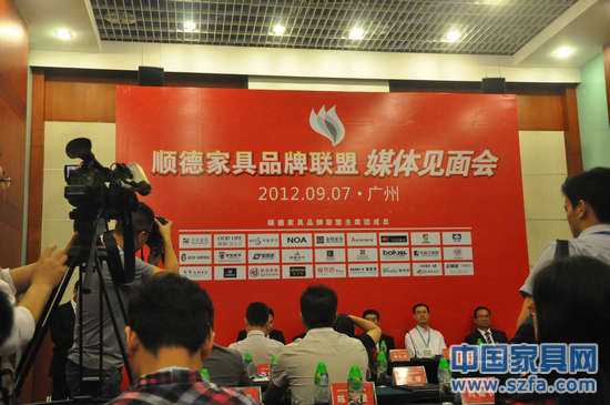 2012年09月07日,順德家具品牌聯(lián)盟于廣交會展館A區(qū)花城廳舉行了媒體見面會。包括廣東電視臺、廣州電視臺、《廣州日報》、《南方都市報》、《羊城晚報》、《南方日報》、《新快報》、《信息時報》、香港《文匯報》、《珠江時報》、《民營經(jīng)濟報》、《佛山日報》、《香港商報》等超過25家大眾媒體及《亞太家具報》、《珠三角家具報》、《000家·財富》、《政府采購信息報》、天天家具網(wǎng)、新浪網(wǎng)、搜狐網(wǎng)等超過15家家具行業(yè)的媒體記者朋友到場進行采訪,中國家具協(xié)會理事長朱長嶺先生、中國對外貿(mào)易廣州展覽總公司總經(jīng)理李德穎先生、廣東省家具協(xié)會會長王克先生、順德區(qū)家具協(xié)會會長黎德先生、順德家具品牌聯(lián)盟主席周振揚先生出席了見面會并發(fā)表了講話,見面會由順德家具品牌聯(lián)盟高級顧問莊子標先生主持。