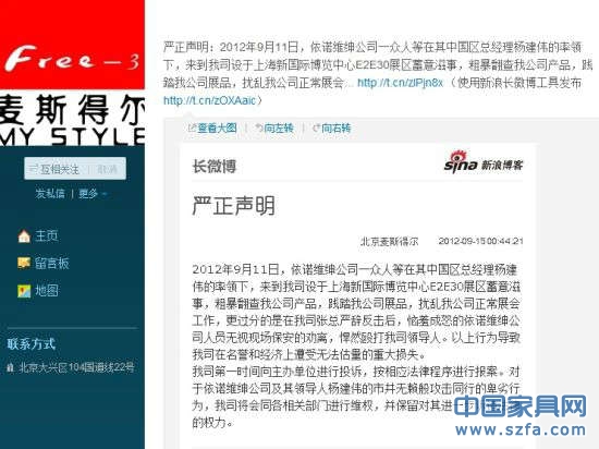 由此,依諾維紳VS麥斯得爾由上海國際家具展現(xiàn)場的“踢館”維權(quán)到展會后的微博“罵戰(zhàn)”升級。