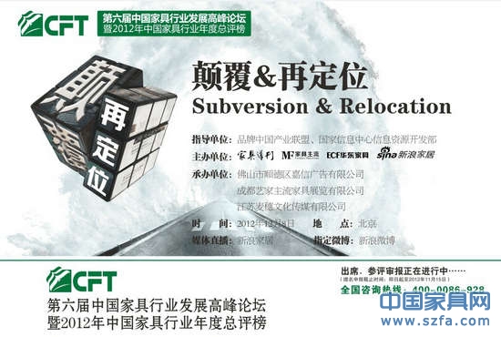為此,由《家具導(dǎo)刊》發(fā)起,攜手《家具主流》、《華東家具》、新浪家居聯(lián)合主辦,并得到了中國家具行業(yè)眾多協(xié)會,以及多個權(quán)威品牌專業(yè)研究機(jī)構(gòu)的大力支持,本年度中國家具行業(yè)的奧斯卡盛會——“顛覆&再定位:中國家具行業(yè)發(fā)展高峰論壇暨第六屆(2012)中國家具行業(yè)年度總評榜”于10月15日正式啟動。本屆總評榜將以“顛覆”思維為驅(qū)動,以“再定位”為研究主題,把脈中國家具產(chǎn)業(yè)鏈的病態(tài),感受轉(zhuǎn)型下內(nèi)需市場的呼吸,對話企業(yè)再定位與產(chǎn)業(yè)生態(tài)鏈的重構(gòu),研究轉(zhuǎn)型升級的戰(zhàn)術(shù),探索脫穎而出的陽光大道。