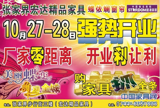 核心提示:10月27日,張家界宏達(dá)精品家具城強(qiáng)勢(shì)開(kāi)業(yè)。蝶依斕沙發(fā)、蝶依斕窗簾、施華洛、港府太子、星港床墊等眾多品牌紛紛同期開(kāi)業(yè)。開(kāi)業(yè)當(dāng)天的廠家零距離、開(kāi)業(yè)利讓利、購(gòu)家具抓金條等一系列優(yōu)惠深深刺激著當(dāng)?shù)厥忻竦南M(fèi)神經(jīng)。