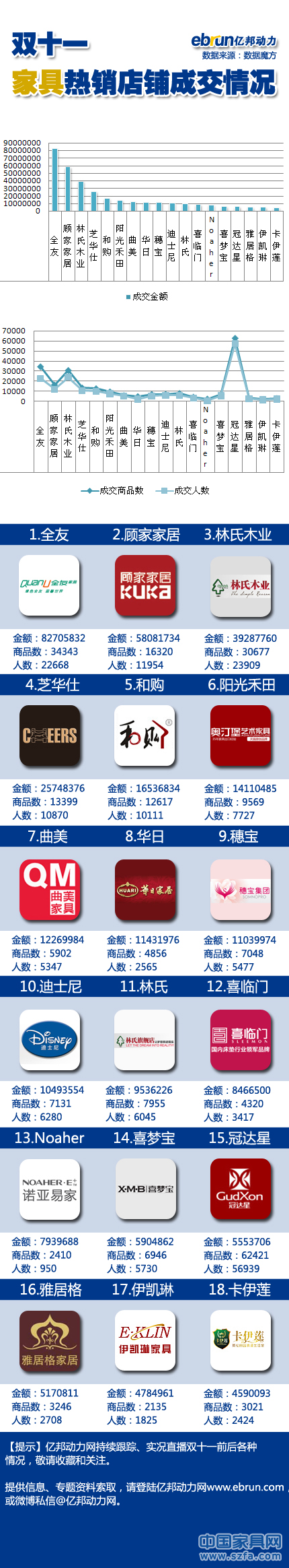 以下是數(shù)據(jù)魔方的雙十一家具前18名具體數(shù)據(jù):