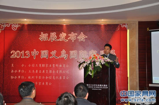 2012年12月7日,首屆中國義烏國際家具展在杭州三立開元大酒店舉辦招展發(fā)布會。據(jù)悉,義烏國際家具展覽會將于2013年4月舉辦。本次杭州招展發(fā)布會上,義烏市有關部門領導和展會組委會,浙江省家具行業(yè)協(xié)會理事長蔣鴻源,義烏市委常委,義烏市副市長陳勇,杭州市經(jīng)信委副處長金煉,全國工商聯(lián)家具裝飾業(yè)商會副秘書長郭力兵,杭州市家具商會名譽會長陳貴榮,杭州市家具商會執(zhí)行會長趙玉林,杭州市家具商會秘書長楊幼明等領導出席會議。