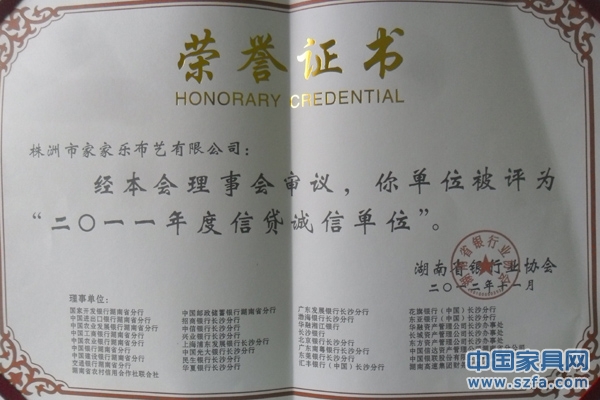 蝶依斕品牌旗下株洲市家家樂布藝公司榮獲“2011年度信貸誠信單位”稱號