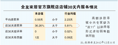 在“雙11”瘋狂銷售30天后的12月11日,記者登錄全友家居官方旗艦店時發(fā)現(xiàn),在“店鋪30天內(nèi)服務(wù)情況”中赫然顯示,退款率達(dá)36.26%,其中,因未收到貨造成退款的有11674次,占退款總次數(shù)13976次的83.5%。