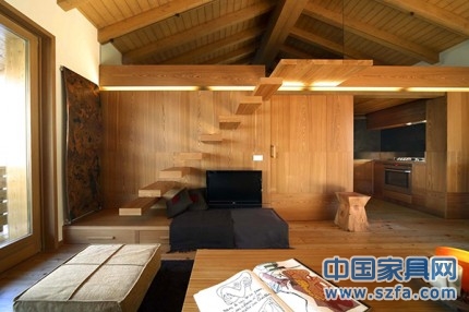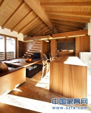 你即將進(jìn)入一個(gè)全部由木材建造的地方,從地板、天花板甚至是家具,所有的一切都為木質(zhì),這種獨(dú)特的細(xì)節(jié)將這個(gè)公寓裝點(diǎn)得無比迷人、溫馨,讓人眼前一亮。這是一棟能讓你聯(lián)想到滑雪度假村的公寓。