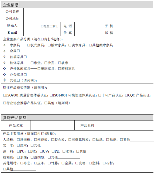 “參評報名表”請于2013年2月1日前傳真至0755-26018227,或電郵:fts@szfa.com,或郵寄至:深圳市南山區(qū)西麗同發(fā)路8號家具研發(fā)基地。請參評企業(yè)積極配合,以便評委更好地了解產(chǎn)品品質狀況,如有任何疑問,請與工作人員聯(lián)系,聯(lián)系電話:400 8888 942。