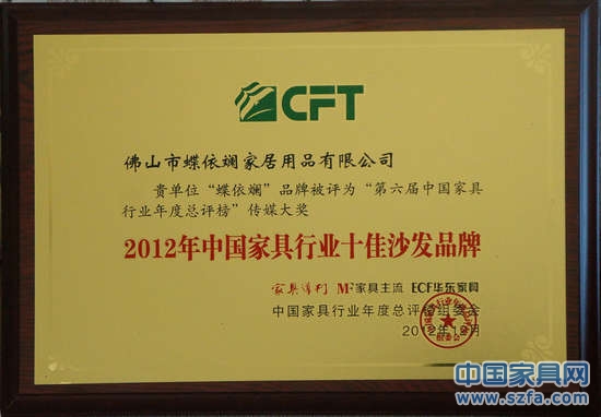 蝶依斕被評(píng)為2012年中國(guó)家具行業(yè)十佳沙發(fā)品牌