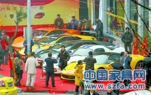 蘭博基尼LP670中國限量版,全球限量10輛,黑灰色,售價780萬左右;法拉利FF,白色,排量6.3升,售價530萬左右;2輛法拉利458,分別有紅色和黃色,每輛售價380萬至580萬;蘭博基尼蓋拉多,橘黃色,458萬至488萬……