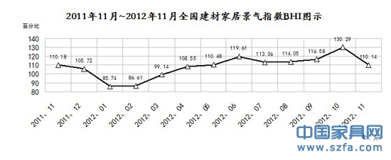 核心提示:由商務(wù)部流通司、中國(guó)建材流通協(xié)會(huì)共同發(fā)布的全國(guó)建材家居景氣指數(shù)BHI 11月份數(shù)據(jù)為110.14,環(huán)比下降了15.47%,同比下降了0.04%。全國(guó)規(guī)模以上建材家居賣場(chǎng)11月銷售額為1070億元,環(huán)比下降24.64%;1-11月累計(jì)銷售額為11461億元,同比下降4.46%。