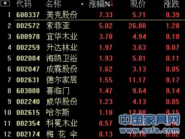 家居用品板塊午后走強(qiáng),居于漲幅榜前位,個(gè)股多數(shù)上漲。截至發(fā)稿前,板塊整體上漲1.94%,美克股份大漲7.33%,索菲亞上漲5.02%,宜華木業(yè)上漲3.78%。