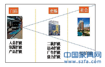 從上圖可以看到,我們可以從門店、賣場、社會三個層面來一一攻破。門店有人員攔截、氛圍攔截、產(chǎn)品攔截三種方式;賣場可以通過二展攔截、活動攔截、廣告攔截和借力攔截四種方式;社會層面可通過渠道攔截的方式。筆者認(rèn)為板式等中低端價格的產(chǎn)品主要圍繞在賣場,中式實木、歐美古典等較高檔的產(chǎn)品需要向外開發(fā)更多的新的渠道,不同的產(chǎn)品決定了不同的業(yè)務(wù)營銷的模式。