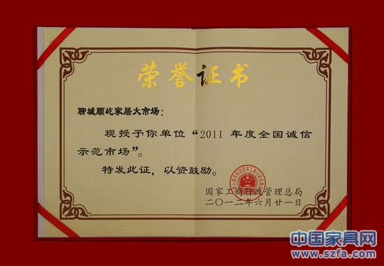 順屹家居經(jīng)過全體員工及商戶的誠信經(jīng)營,以及不驕不躁的共同奮斗,2012年底順屹家居又獲得新的榮譽,被評為“2011年度全國誠信示范市場”。