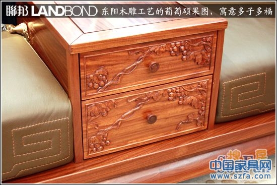 抽屜面板上的“多子多福”圖由木雕大師制作,東陽木雕派手法,即使在平面上,也將描繪對象雕刻的立體生動,栩栩如生,富有神韻。“多子多福”圖既體現(xiàn)了非凡的木雕工藝,又傳達了如意多福的美好寓意,形神兼具。