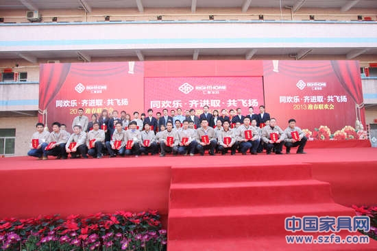 聯(lián)歡會在一派喜慶、祥和的開門紅舞蹈中拉開帷幕,四位俊男美女主持陣容華麗亮相。迪諾雅家具董事長尤國忠發(fā)表了激情洋溢的新年賀辭,回顧了2012年迪諾雅家具取得的各項工作成就,向辛勤工作的廣大員工和關(guān)心支持公司發(fā)展的各位嘉賓朋友表達誠摯的謝意并致以新春的祝福,并為未來發(fā)展送上美好的祝愿。隨后,尤國忠董事長為公司2012年度優(yōu)秀員工、優(yōu)秀新員工和2012年度優(yōu)秀供應(yīng)商代表頒發(fā)榮譽證書和獎牌并合影留念,感謝大家在2012年的辛勤努力和對迪諾雅家具長期的關(guān)心與支持。