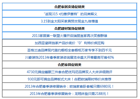 縱觀合肥家居折扣報(bào),建材家具促銷(xiāo)基本上持平,眾多商家正把眼光緊盯著“3.15”。而從記者現(xiàn)場(chǎng)采集的信息來(lái)看,2013年3月份家居促銷(xiāo)力度絲毫不比去年差,眾多商家更是看好今年的市場(chǎng)。從合肥3月份天氣來(lái)看,非常適合裝修業(yè)主裝修,時(shí)下正為裝修發(fā)愁的業(yè)主,大可關(guān)注萬(wàn)家家居最近的春裝活動(dòng)。