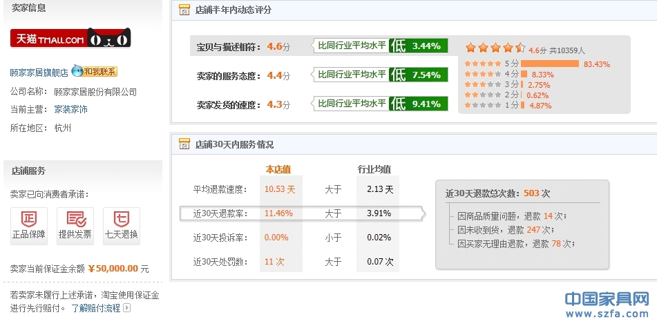 記者查看了顧家家居30天內的服務概況,發(fā)現(xiàn)30天內因為未收到貨退款次數(shù)有247次。而就在去年的12月16日,有媒體曾報道顧家家居天貓旗艦店的退款率達到124.95%。