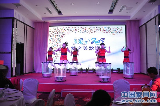 當(dāng)晚,夢(mèng)之美家具傾力打造了一場(chǎng)內(nèi)容豐富多彩、氛圍和諧溫暖的晚宴。夢(mèng)之美員工自編自導(dǎo)的舞蹈“浪漫櫻花”動(dòng)感十足,激情四射的水鼓舞迎來(lái)了觀眾的熱烈掌聲,生產(chǎn)一線的李建中老師傅帶來(lái)了數(shù)來(lái)寶,最后的壓軸大戲激光舞更是將晚會(huì)推向了高潮。整臺(tái)晚會(huì)充滿了濃濃的人情味,使在場(chǎng)的經(jīng)銷商朋友有一種回家的親切感。
