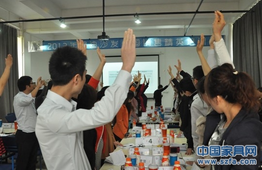 高老師快樂授課,圖為在講解家居顧問的八個(gè)流程訓(xùn)練:迎客、接觸、產(chǎn)品介紹、引導(dǎo)顧客感受產(chǎn)品、開顧客的心門、處理反對(duì)意見、成交動(dòng)作、留客。