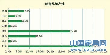 所經(jīng)營(yíng)品牌產(chǎn)地情況,其中來(lái)自廣東的品牌占比39.78%,浙江本地29.03%,第三位的是江蘇,12.90%。此種情形不只是浙江,在其他地方的賣場(chǎng)也會(huì)出現(xiàn)經(jīng)銷商所代理的品牌廣東占比居多。廣東,素有“中國(guó)家具看廣東”,另外由于廣東與國(guó)際接軌,潮流更新快,也不乏一些內(nèi)地的企業(yè)注冊(cè)廣東的品牌。近幾年,浙江的家具產(chǎn)業(yè)也不斷崛起,浙江土地上本土品牌代理多也是很自然的事情。