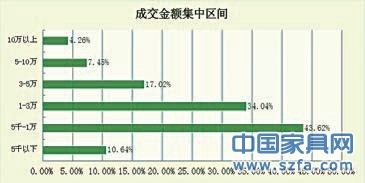 對(duì)于家具單筆成交的金額主要集中在兩個(gè)區(qū)段,5千-1萬(wàn)、1-3萬(wàn),分別占比43.62%和34.04%。家具對(duì)于中國(guó)市民來(lái)說(shuō)目前還算不上是一個(gè)快速消費(fèi)品,5千到3萬(wàn)消費(fèi)比例為77.66%,最少的區(qū)段的是10萬(wàn)以上,占比4.26%,畢竟對(duì)于家具這種高端需求還是比較小。