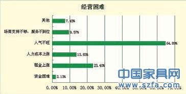 問(wèn)卷中關(guān)于經(jīng)營(yíng)中的一些困難, 賣場(chǎng)人氣不旺遙遙領(lǐng)先成為NO.1,達(dá)到64.89%。其次是租金上漲,23.4%的比例,人力成本上漲以及廠商支持不夠分別為13.83%和9.57%,資金困難2.13%,由此可見(jiàn)大多經(jīng)銷商經(jīng)營(yíng)過(guò)程中都不差錢。不過(guò)人力成本上漲是整個(gè)社會(huì)的現(xiàn)象并不是家具行業(yè)的特例。賣場(chǎng)人流量是影響銷售的關(guān)鍵因素,但是隨著各種活動(dòng)的此起彼伏,也并非所有的活動(dòng)都奏效。