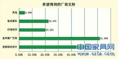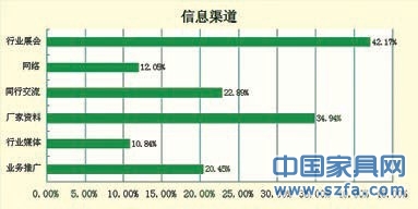 關(guān)于獲取產(chǎn)品的信息渠道,行業(yè)展會(huì)占比42.17%,其次是廠家資料,第三是同行交流。而業(yè)務(wù)推廣、網(wǎng)絡(luò)以及行業(yè)媒體則分別為20.45%、12.06%以及10.84%。從中可知,隨著家具行業(yè)的競(jìng)爭(zhēng)越來(lái)越激烈,以前生產(chǎn)出來(lái)就自會(huì)有經(jīng)銷商找上門來(lái)代理的時(shí)代漸漸過(guò)去了,家具廠家的業(yè)務(wù)推廣也漸漸重要起來(lái)。