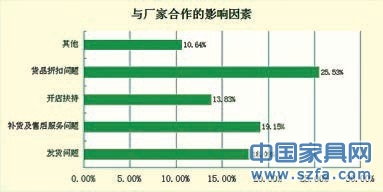 在影響與廠家合作的因素中,貨品折扣是經(jīng)銷商最關(guān)心的,這與消費(fèi)者進(jìn)店購(gòu)買家具是一個(gè)理,消費(fèi)者希望拿到性價(jià)比高的產(chǎn)品,同樣經(jīng)銷商也希望從廠家拿到最低折扣的產(chǎn)品。在補(bǔ)貨及售后服務(wù)以及發(fā)貨問(wèn)題上分別有19.15%和18.09%的經(jīng)銷商選擇,也不乏一些經(jīng)銷商抱怨廠家的發(fā)貨不及時(shí)以及產(chǎn)品更新周期長(zhǎng)。但是在調(diào)研過(guò)程中,大部分經(jīng)銷商都表示與廠家之間的大部分時(shí)候合作的很愉快。但是也有一些廠家在經(jīng)銷商加盟拿貨后采取放任自流式的態(tài)度。