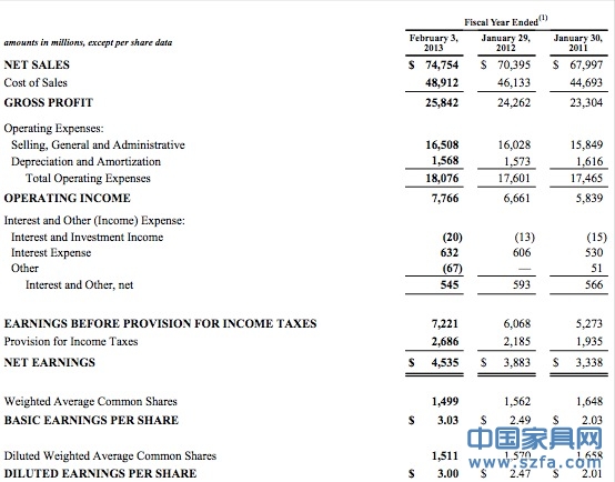 受益于美國(guó)房地產(chǎn)市場(chǎng)的不斷回暖,近三個(gè)財(cái)年家得寶凈銷(xiāo)售額穩(wěn)定增長(zhǎng),由2010財(cái)年(截止2011年1月30日)的680億美元增至2012財(cái)年(截止2013年2月3日)的748億美元,毛利潤(rùn)由233億美元增至258億美元;運(yùn)營(yíng)利潤(rùn)由58億美元增至78億美元;凈利潤(rùn)由33億美元增至45億美元。