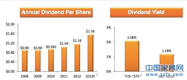 股息:將利潤(rùn)的50%用來(lái)支付股息,且每年將提高股息,預(yù)計(jì)2013年每股年度股息達(dá)到1.56美元。