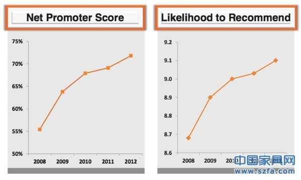 家得寶的服務(wù)得到的是用戶競(jìng)相向周?chē)H朋好友推薦的“口碑”。數(shù)據(jù)顯示,家得寶的凈推薦值(Net Promoter Score,簡(jiǎn)稱NPS)歷年來(lái)呈上升趨勢(shì),在2012年超過(guò)70%;推薦可能性(Likelihood to Recommend)從2008年的不足8.7上升至2012年的9.1,這表明公司擁有一批高忠誠(chéng)度的好客戶。