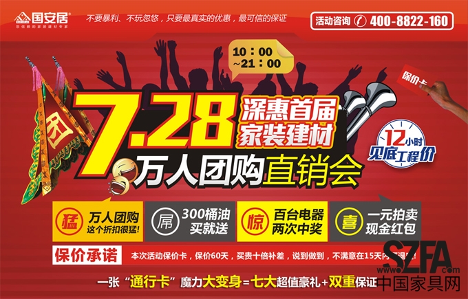 惠陽(yáng)國(guó)安居深惠首屆家裝建材萬(wàn)人團(tuán)購(gòu)會(huì)7月28日火爆上演,本場(chǎng)活動(dòng)將是一次史無(wú)前例的家裝年度盛會(huì),集合娛樂(lè)、購(gòu)物、省錢于一體的大型團(tuán)購(gòu)PARTY。