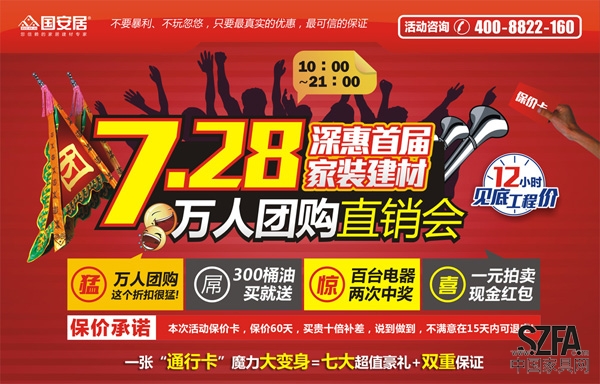 據(jù)各大報(bào)紙和新聞媒體加急報(bào)道:7月28日將是惠陽(yáng)史上最熱的一天,號(hào)稱來(lái)自惠陽(yáng)國(guó)安居名為“首屆深惠家裝建材萬(wàn)人團(tuán)購(gòu)直銷(xiāo)會(huì)”熱流將在惠陽(yáng)人民四路國(guó)安居登陸。這里將聚集深圳、惠州兩地業(yè)主,匯集150余戶國(guó)內(nèi)外一線品牌商家,打造一場(chǎng)史無(wú)前例的年度家裝盛會(huì),折扣低至2折,現(xiàn)場(chǎng)融合吃、玩、購(gòu)物于一體構(gòu)造一個(gè)超大型、火爆的大PARTY。