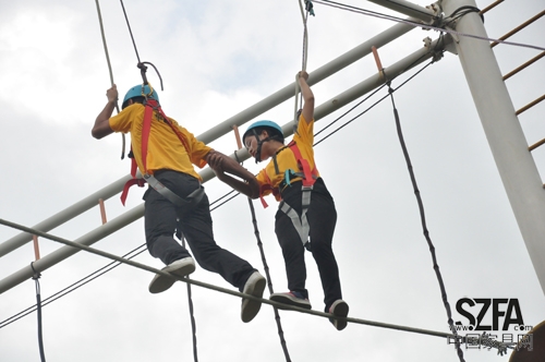 穿上安全服后,學(xué)員們逐個(gè)進(jìn)行高空項(xiàng)目。在搭檔的配合下,隊(duì)員的吶喊鼓勵(lì)下,站在10米高空的每個(gè)人都成功克服心理的恐懼,勇敢挑戰(zhàn)困難,突破自己,激發(fā)了潛能。