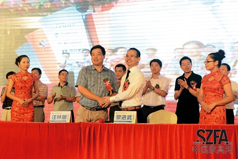 寶居樂董事長(zhǎng)黎進(jìn)武(右)與居然之家董事長(zhǎng)汪林朋(左)簽字