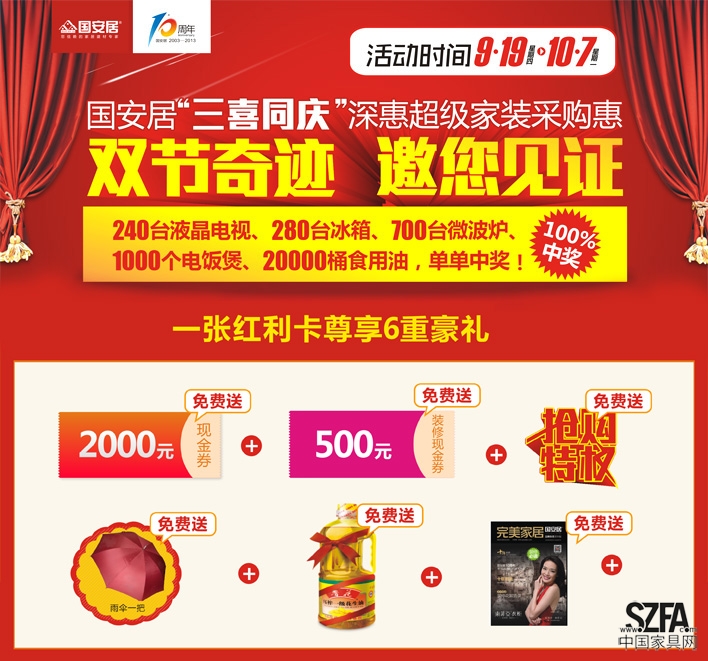 在活動(dòng)期間持“紅利卡”到國(guó)安居各店可領(lǐng)取1.8升食用油、國(guó)安居紀(jì)念雨傘一把、2000元現(xiàn)金抵扣券、500元裝修基金、搶購產(chǎn)品特權(quán)和《完美家居》雜志一本等六重好禮。10月7日上午10:30-12:00,憑“紅利卡”還可搶購399元名牌坐廁、29元/片名牌瓷磚499元/件櫥電、999元/米、499元/㎡衣柜、39元/㎡地板、1299元/套實(shí)木門、20元/米布衣等百款超低價(jià)產(chǎn)品,另可購買國(guó)安居指定品牌專柜低至3折特價(jià)產(chǎn)品?;顒?dòng)期間內(nèi)凡下定還可參與抽家電活動(dòng),百分百中獎(jiǎng),每單賺不停。液晶電視240臺(tái),品牌冰箱280臺(tái),品牌微波爐700臺(tái),品牌電飯煲1000個(gè),食用油10000桶,超多獎(jiǎng)品陣容倍增假日期間親們的購物驚喜!購卡顧客即日起至十一七天在本商場(chǎng)購物不僅享受全部的促銷讓利活動(dòng)。還將尊享該商場(chǎng)專門設(shè)置的保價(jià)60天買貴雙倍補(bǔ)差,7天內(nèi)不問理由無條件退定的服務(wù)保障。