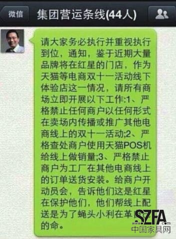 京華時報記者最早看到車建新的微信截圖是在10月27日,并就此與紅星方面進行了核實,結(jié)果是未予否認。該微信應(yīng)發(fā)自車建新的工作號,主要內(nèi)容是針對大量品牌欲將紅星作為“雙11”天貓線下體驗店的對策——“嚴(yán)禁任何商戶以任何形式在賣場內(nèi)傳播或推廣其他電商線上的‘雙11’活動;嚴(yán)格查處商戶使用天貓POS機給線上做銷量;嚴(yán)格禁止商戶為工廠在其他電商線上的訂單送貨安裝。”車建新要求全國賣場統(tǒng)一徹查。