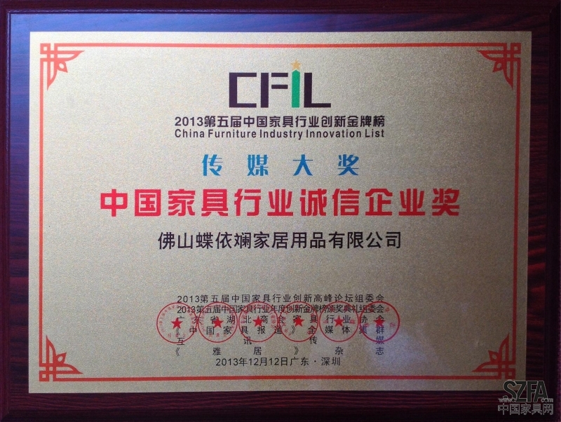 蝶依斕榮獲中國(guó)家具行業(yè)誠(chéng)信企業(yè)獎(jiǎng)