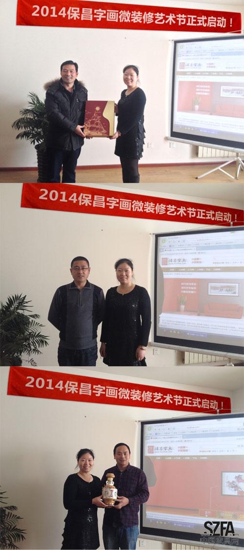 在本次藝術(shù)節(jié)發(fā)布會上,香港豪泰集團(tuán)、中山外星科技集團(tuán)、小霸王公司、河南新家園成為藝術(shù)節(jié)的新年首批簽約客戶。企業(yè)代表和保昌字畫網(wǎng)現(xiàn)場簽下新年合約。藝術(shù)節(jié)上中國柏青書道院長柏青先生、北京神奇世界董事長戚海生先生、保昌字畫商城總經(jīng)理葛慧女士及保昌字畫微裝修藝術(shù)節(jié)謝遠(yuǎn)霖總監(jiān)一起為“2014保昌字畫微裝修藝術(shù)節(jié)揭幕。