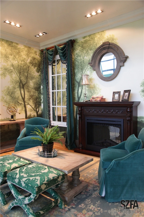 空間整體的色彩以灰橄欖綠、做舊金為主色調(diào),加上主色為亞麻原木色的家具沙發(fā),并描上暗金色點(diǎn)綴其中,再配以依曼琪獨(dú)一無二的懷舊風(fēng)景強(qiáng)制,充分散發(fā)出整體空間的高貴與典雅、溫馨與舒適的自然美感。在面料選擇方面,多采用絨、麻、棉等材質(zhì),砂巖人體雕塑與精致飾品的結(jié)合更豐富了整體空間的構(gòu)成,從而營造出人與自然的和諧之美。