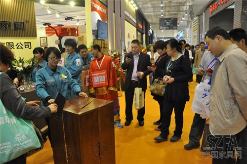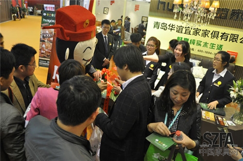 本屆展會(huì)華誼家具展出的仍是其經(jīng)典款“祥和”純實(shí)木系列的升級(jí)版和歐式純實(shí)木家具“歐森堡”系列。開館第一天,華誼家具的場(chǎng)館內(nèi)水泄不通,人流如織。鑒于去年華誼家具在青島展上的出色表現(xiàn),本屆展會(huì),華誼家具培訓(xùn)了80余名員工服務(wù)整個(gè)場(chǎng)館接應(yīng)與活動(dòng)事宜,他們分別在發(fā)紅包、舉牌、抽獎(jiǎng)、送抱枕、派發(fā)禮物、掃微信送AP等活動(dòng)環(huán)節(jié)與客戶互動(dòng),10余輛VIP接送車負(fù)責(zé)經(jīng)銷商去集團(tuán)總部參觀。
